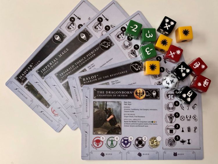 Nachdem wir die vielen verschließbaren Plastiktütchen beiseite gelegt haben, finden wir die Charakter-Karten und die Würfel. Die 5 Charakter-Karten stellen eine erste Auswahl an speziellen Charakteren dar, die in den Questen vorkommen. Die Karten klären uns über so typische Werte wie Gesundheit, Magie, Agilität usw. des jeweiligen Charakters auf. Modiphius bietet hierzu auch die passenden Miniaturen im 32mm-Maßstab an. Die 13 verschiedenen Würfel sind spezifisch für das System: Der weiße Würfel ist der Skill-Dice, der immer zum Einsatz kommt, wenn eine Fähigkeit eingesetzt wird. Die grünen Würfel sind die sogenannten Accuracy Dice, die beispielsweise beim Kampf zum Einsatz kommen und den Skill-Wurf modifizieren. Die schwarzen, roten und gelben Würfel sind die sogenannten Effect Dice und dienen der Bestimmung des Schadens.