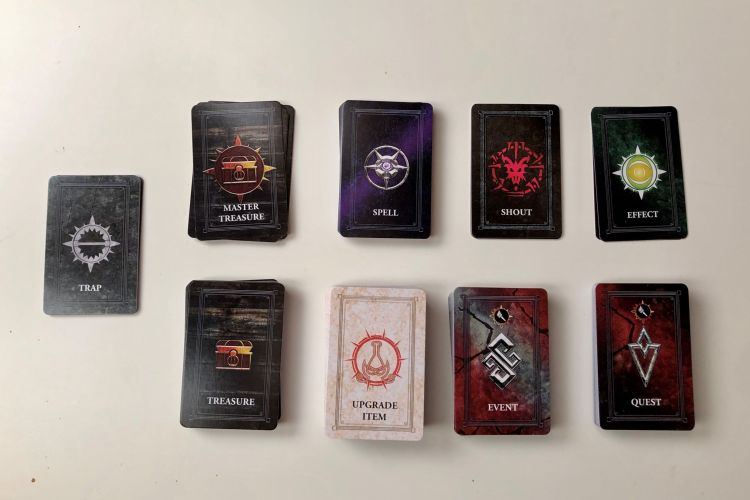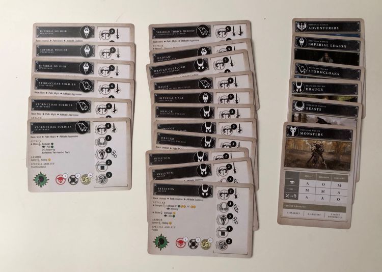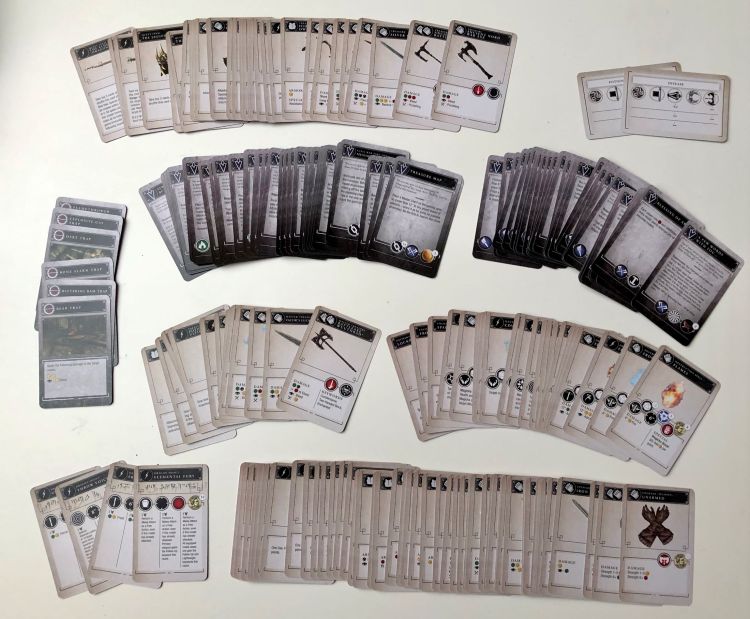 Die Box offenbart uns im weiteren noch viele verschiedene andere Karten – wer hier Sleves anwenden möchte, sollte sich aufgrund der schieren Anzahl auf eine größere Investition einstellen. Für jede Fraktion ist eine entsprechende Fraktionskarte enthalten, die die Spezialitäten und Sonderregeln enthält. Außerdem brauchen unsere Charaktere natürlich noch ein paar Minions in ihrer Gruppe, die die Drecksarbeit machen und so gibt es hierfür ebenfalls entsprechende Profilkarten. Das gleiche gilt auch für die Gegenspieler, die Draugr, die in verschiedenen Szenarien „vom Spiel“ gesteuert werden. Ansonsten gibt es noch jede Menge Ausrüstung, Sprüche, Schätze, Events und Nebenquesten sowie – natürlich – die verschiedenen Schreie des Drachengeborenen. Abgerundet wird das ganze Set durch eine Handvoll Papp-Marker, die das Nachverfolgen von Statuseffekten und ähnlichem ermöglichen.