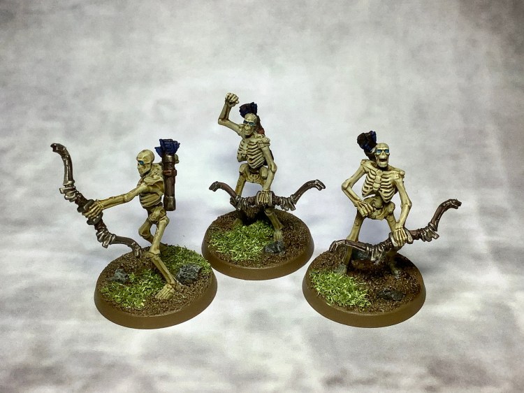 - Holzteile an Bögen und Köchern: Charred Brown (Vallejo Game Colour), Agrax Earthshade, Gorthor Brown (Citadel Layer)