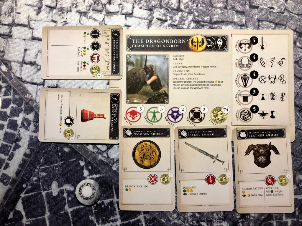 Gemäß den Regeln statten wir zuerst unser Drachenblut aus. Sie erhält eine Lederrüstung (4 Septimen), ein Stahlschwert (5 Septimen), einen Holzschild (3 Septimen) und einen kleinen Heiltrank (3 Septimen). Sie beherrscht bereits den Drachenschrei „Unerbitterliche Macht“, der einem Wert von 6 Septimen entspricht. Somit kommen wir auf einen Gesamtwert von 95 Septimen unserer Ein-Frau-Armee.