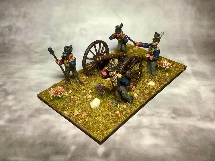 Bei den Artilleristen der Royal Artillery habe ich mich am Bemalschema von Warlord-Games orientiert. Dunkelblaue Jacken mit rotem Innenfutter und gelben Kordeln, graue Hosen, schwarze Tschakos mit unterschiedlich gefärbten Federn je nach Dienstgrad. Dies entspricht den von mir zu Rate gezogenen Quellen auch den Uniformen der Artilleristen im Dienste der Royal Marines, da diese sich letztendlich nur durch die Kragenspiegel als solche zu erkennen gaben.