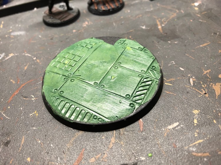 Mein gesamter Cult hat Necromunda-Bases, die diesen Makropolen-Bode aus Flurplatten und Gittern darstellt. Diese Bases gibt es nur bis 40mm, daher musste für die Base des Waffenteams eine andere Lösung her. Zum Glück gibt es Green Stuff und Textur-Roller und so wurde der Boden kurzerhand selbst strukturiert. Ich habe meinen letzten Rest Green Stuff dafür entsprechend vorbereitet und mit einem Nudelholz direkt auf der Base ausgerollt, um möglichst sparsam mit dem begrenzten Material zu arbeiten. Leider gab die Base bei Rollen nach unten hin nach, da sie hohl ist, und so ist das Ergebnis nicht ganz so gleichmäßig eben. Anschließend bin ich noch mit dem gut geölten Textur-Roller darüber und fertig war die Struktur. Etwas Green Stuff fehlte und so blieb eine Ecke frei, die es zu füllen galt.