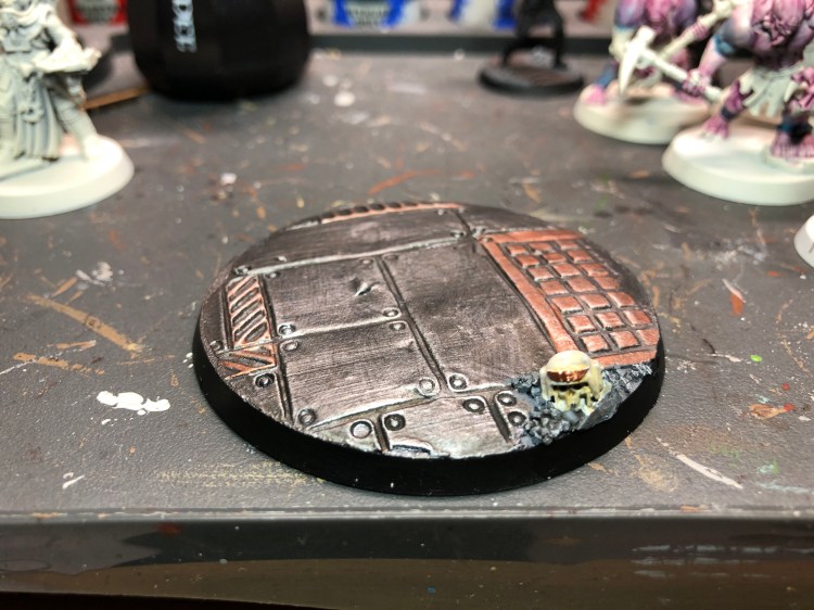 In den Boxen der Acolyte Hybrids befindet sich ein Bit, dass besser nicht geeignet sein könnte: ein Schädel, der noch in einem cadianischen Helm steckt. Also habe ich diesen aufgeklebt und damit war die Lücke geschlossen. Schwarze Grundierung, eine erste Farbschicht mit VMC Gunmetal, ein Wash mit Nuln Oil, ein paar Highlights mit Cidatel Balthasar Gold, ein weiterer Wash mit Agrax Earthshade und ein finales Bürsten mit Necron Compound – fertig war die Base. Naja, fast. Der Kopf fehlte noch. Da ich die Modelle des Cults mit Contrast Paints bemale, wollte ich hier diesen Stil beibehalten. So wurde nur der Kopf mit Cidatel Grey Seer aus dem Farbtöpfchen per Pinsel grundiert. Der Kopf wurde dann komplett mit Skeleton Bone bemalt, auf dem Helm allerdings nur ganz dünn. Den Helm selbst habe ich dann mit Cidatel Pallid Wych Flesh wieder aufgehellt. Damit war die Base nun aber wirklich fertig.