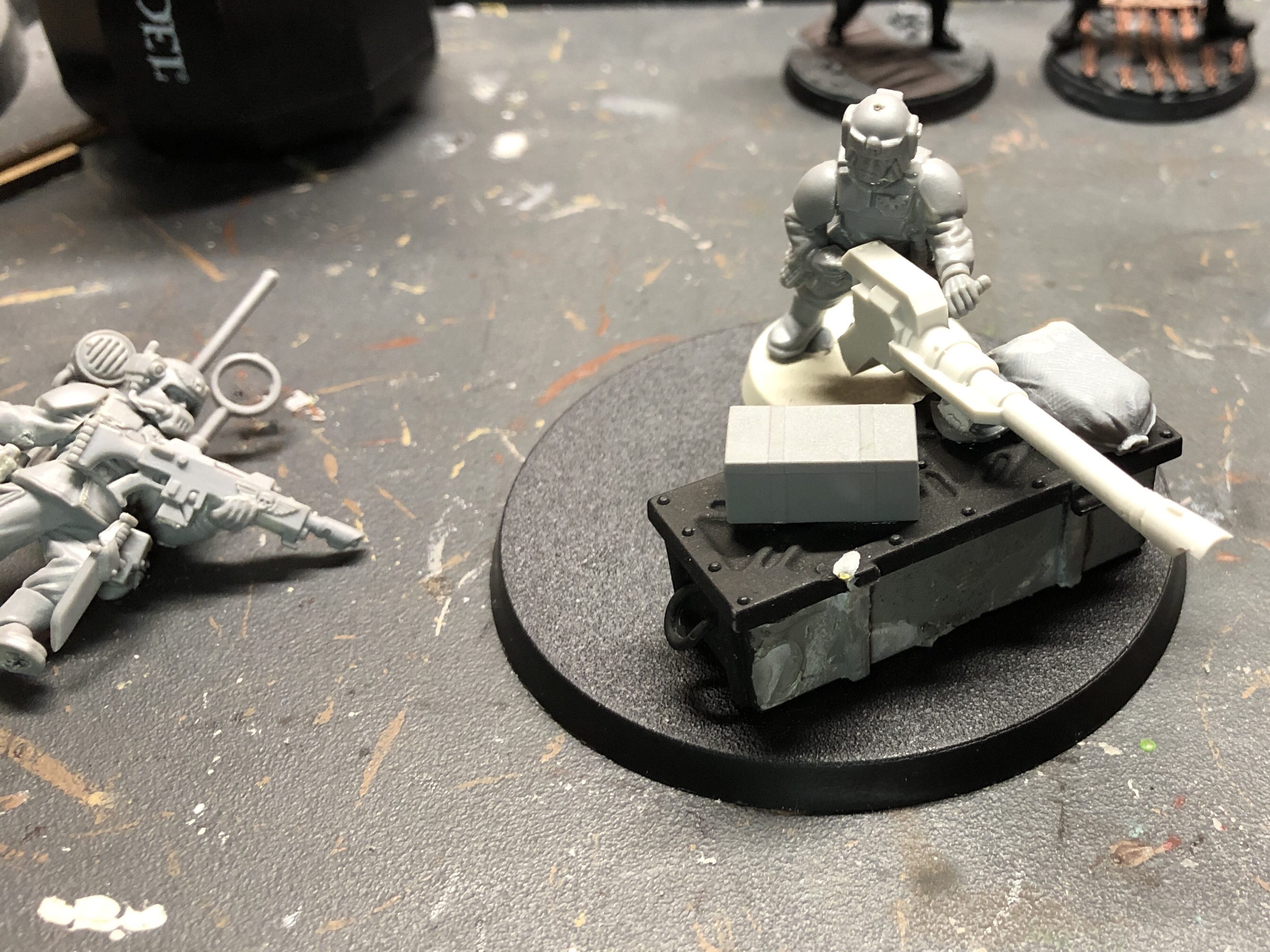 Im ersten Schritt ging es darum, dass notwendige Material zusammenzustellen. Meine Idee war, ein Team zu bauen, dass eine improvisierte Stellung hält. Immerhin zetteln die Genestealer gerne Aufstände an und was passt dazu besser, als improvisierte Barrikaden. Zwei cadianische Soldaten hatte ich noch, ein Freund half mir mit einer Laserkanone, 60-mm-Base, zwei Kisten und einem Sandsack aus. Das ganze wurde probehalber arrangiert und schon war die Zielrichtung klar.