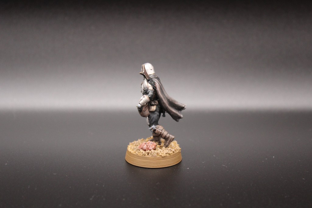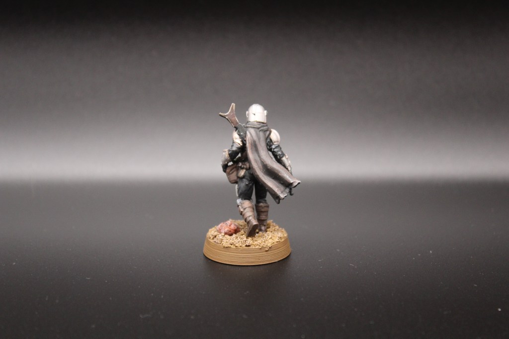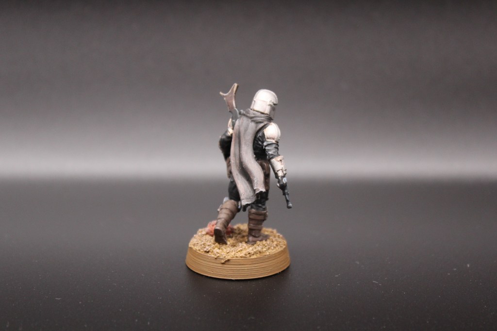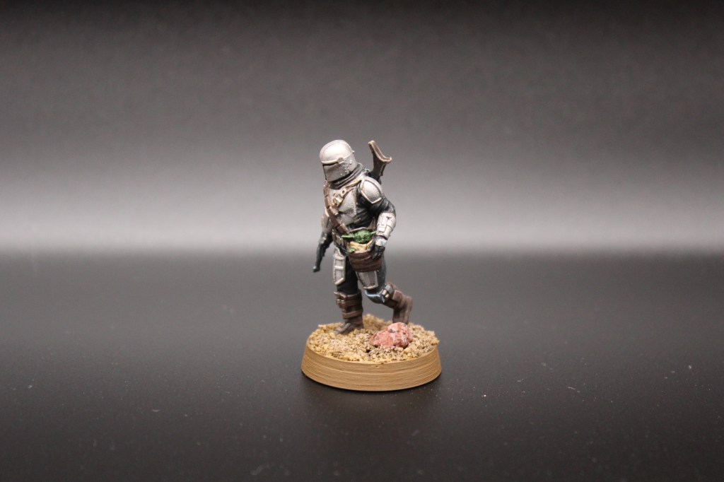 Kommen wir nun zu den Minis im Einzelnen. Ich will gar nicht lang und breit auf die Bemalung eingehen, nur kurz einzelne Punkte ansprechen. Bei der Rüstung von Din Djarin habe ich lange überlegt, wie ich sie malen kann. Ich finde, dass sie nicht rein metallisch silbern ist, sondern eher einen Touch in Richtung Messing hat. Eine passende Farbe hatte ich allerdings nicht zur Hand. Letztendlich habe ich mich für eine Grundfarbschicht mit Chrome von Vallejo Model Air (VMA) entschieden. Über diese Schicht habe ich dann mit Bronze, ebenfalls von VMA, genebelt. Anschließend folgte dann mit dem Pinsel ein gezieltes Aufbringen von Citadels Agrax Earthshade in den Vertiefungen. Ich bin mit dem Ergebnis recht zufrieden, wobei die Farbe für meinen Geschmack zu körnig aussieht und nicht glattpoliert, wie die Rüstung eigentlich ist. Der Grund dafür ist mir noch nicht klar, möglicherweise habe ich den Druck an der Airbrush zu hoch eingestellt. Hier nun das fertige Ergebnis.