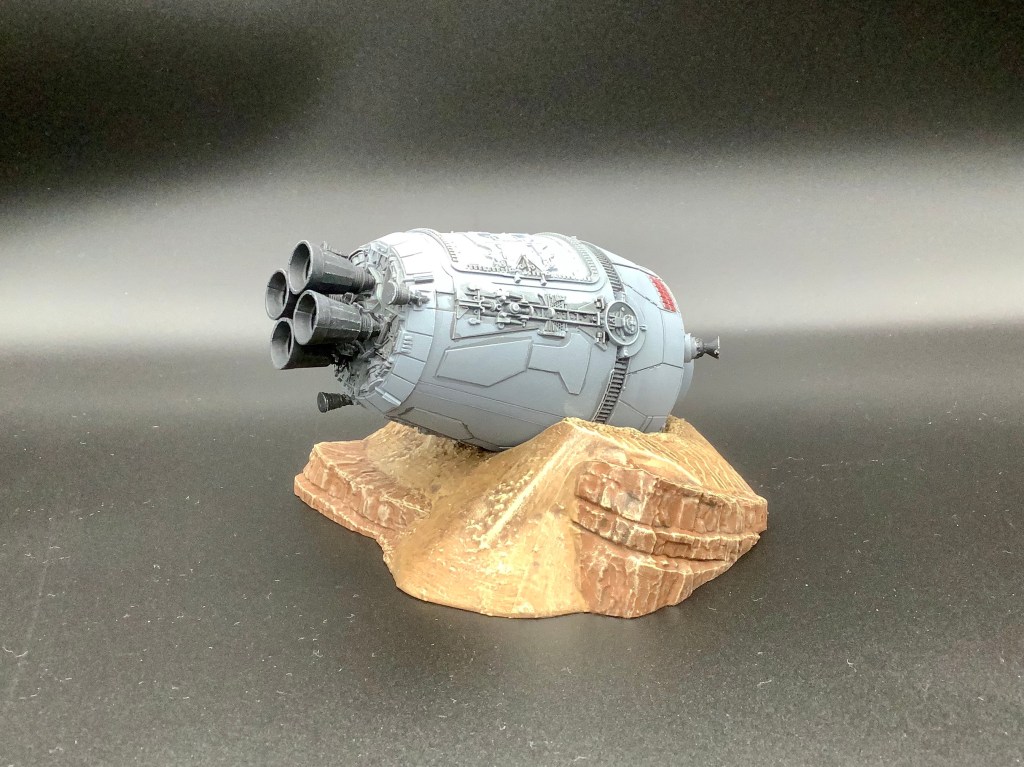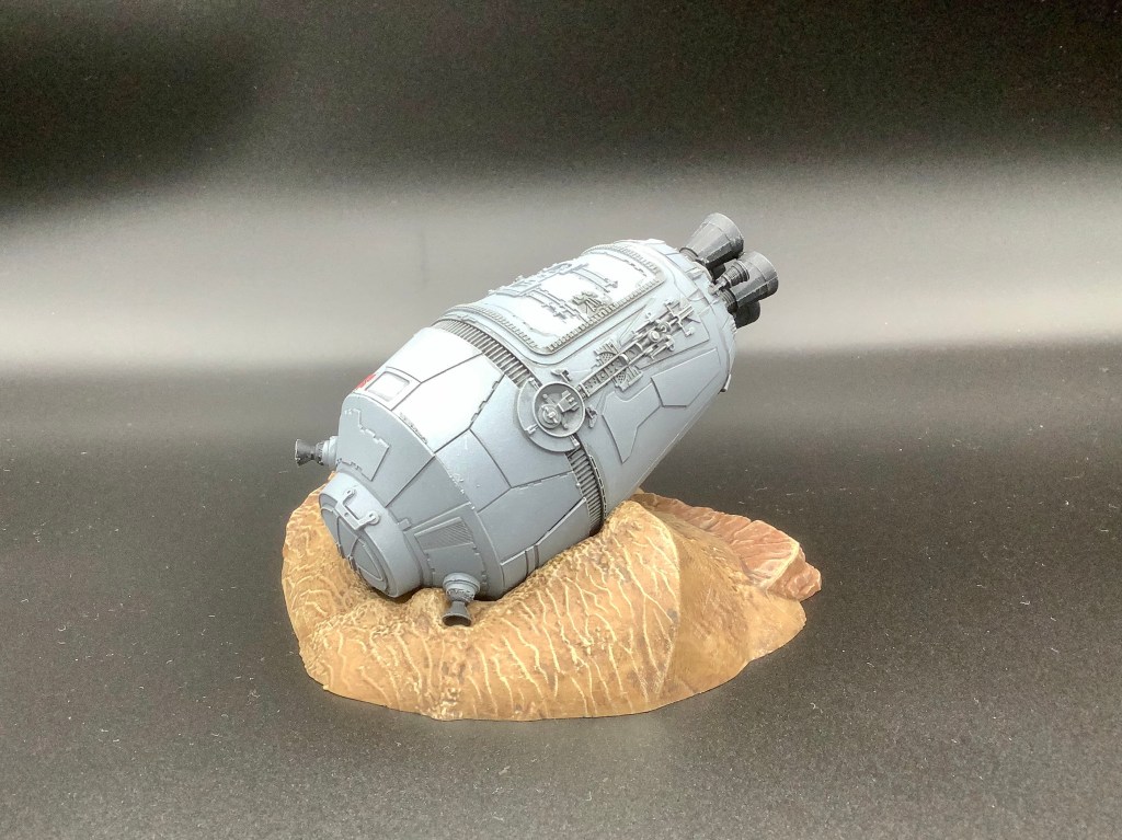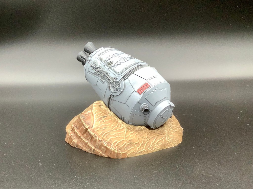 Die Beiden kommen zusammen in der Packung mit ihrer Rettungskapsel, die sie zu Beginn von Teil IV auf den Planeten Tatooine bringt. Die Kapsel ist separat von ihrer Sandbase und wird dort nur hineingelegt. Bei der Base habe ich wieder die rötlichen Sandtöne der steinigeren Wüstenteile von Tatooine gewählt, damit es zum Rest des Geländes passt (siehe meinen früheren Beitrag „X-Wing als Terrain„). Für die Steine habe ich eine Mischung aus Flat Earth, Red Leather und Dark Sand – alle VMC – verwendet. Für den Sand entfällt dann Red Leather. Anschließend trockenbürsten in verschiedenen Schichten mit Sandtönen und fertig ist das Ganze.
