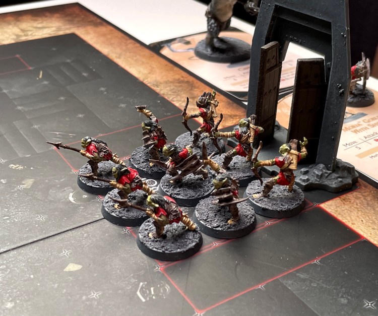 In den Eingang kommen 12 Moria-Goblins nach Wahl des Spielers. Ich habe die Goblins mit den Speeren nach vorn gestellt, damit sie bereits in der ersten Runde einen Angriff durchführen können. Rein von der Bewegung kommen sie nämlich nicht an die Helden heran, aber mit den Speeren können sie über eine Entfernung von zwei Feldern angreifen. Die restlichen Goblins und der Höhlentroll werden zunächst beiseitegestellt und kommen erst später im Spiel an die Reihe. Jeder Typ Goblinkämpfer (Speerträger, Bogenschütze, Schwert & Schild) sowie der Höhlentroll haben ebenfalls eine Profilkarte, die im Prinzip denen der Gefährten gleichen. Lediglich die Heldenaktion fehlt.