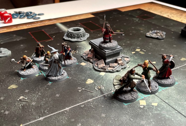 Aber zurück zum Aufbau. Die Startpositionen der einzelnen Minis sind klar definiert. Die Gefährten werden auf die extra markierten Felder gestellt. Zusätzlich besitzt jeder Charakter eine entsprechende Profilkarte, die seine Werte zu Bewegung, Angriff, Verteidigung und die Anzahl an Lebenspunkten enthält. Ebenfalls beschrieben sind Sonderfertigkeiten und die mögliche Heldenaktion, die bei einem Würfelergebnis von „Der eine Ring“ ausgeführt werden kann. Dazu später mehr, wenn wir einen Blick auf die Würfel werfen.