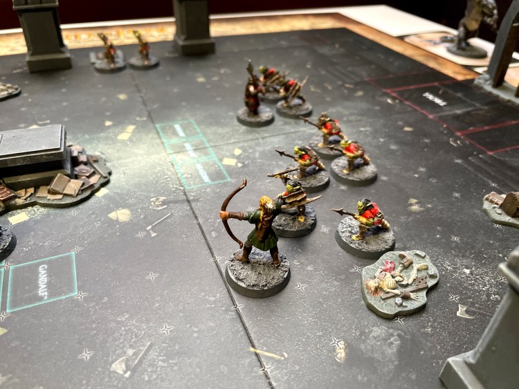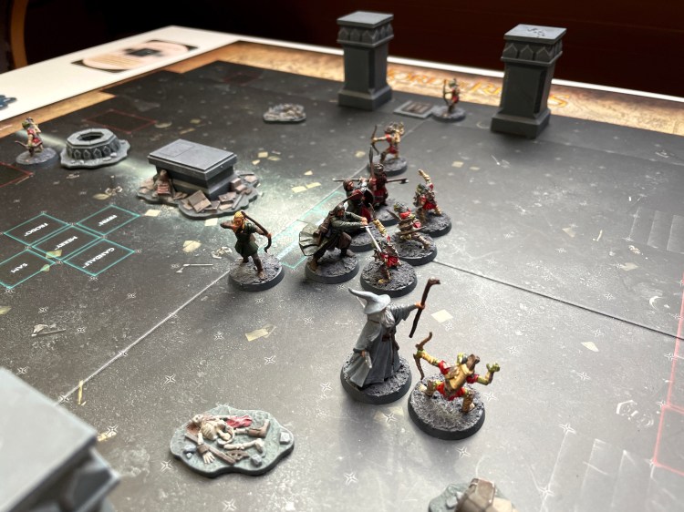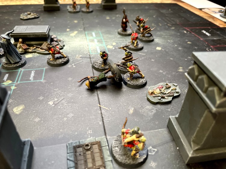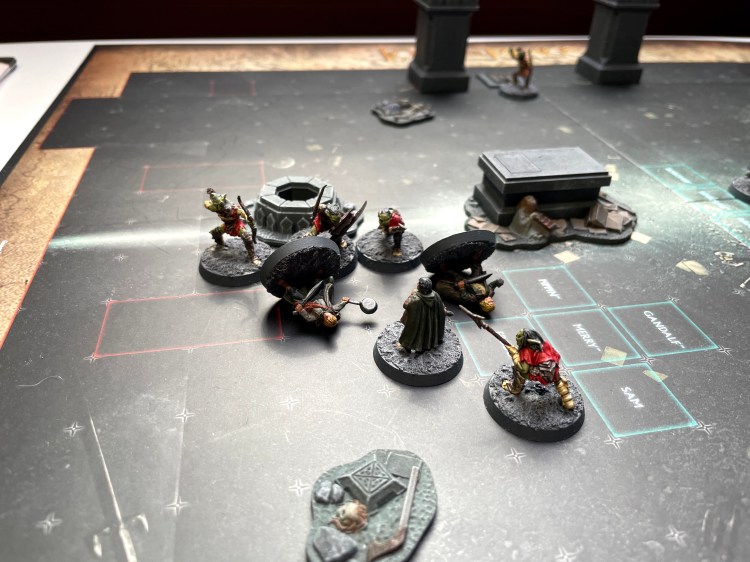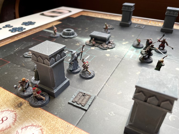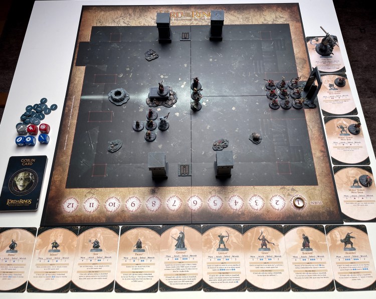 Mit lautem Gebrüll stürzt sich Aragorn dem Goblin entgegen, der vor ihm steht und bereitet ihm schnell ein Ende. Legolas tritt etwas nach rechts und greift einen gepanzerten Goblin mit seinem Bogen an. Der Pfeil tötet diesen direkt und er kann einen weiteren Pfeil auf einen Goblin-Bogenschützen abschießen (einer von Legolas Attackewürfeln zeigte das Ringsymbol, so dass er sofort eine weitere Attacke durchführen darf). Auch dieser geht sofort zu Boden. Boromir folgt Aragorns Beispiel und stürzt sich ebenfalls auf den Goblin vor ihm. Er verpasst ihm mit seinem Schild einen Schlag, sodass der Goblin zurückweichen muss. Während er nach hinten taumelt, gibt ihm Boromir den Rest. Gimli stürzt sich ebenfalls ins Getümmel und tötet einen der Angreifer mit seinen Äxten. Gandalf versucht, einen Goblin-Bogenschützen auszuschalten, aber dieser ist zu flink und die Attacke geht ins Leere. Währenddessen bringen sich die Hobbits hinter einer Säule in Sicherheit, sie überlassen den Kampf lieber den erfahrenen Kriegern. Somit endet Runde 1 auch für die Gefährten, die die Angreifer ganz schön dezimiert haben. Aber das war nur die erste Welle…