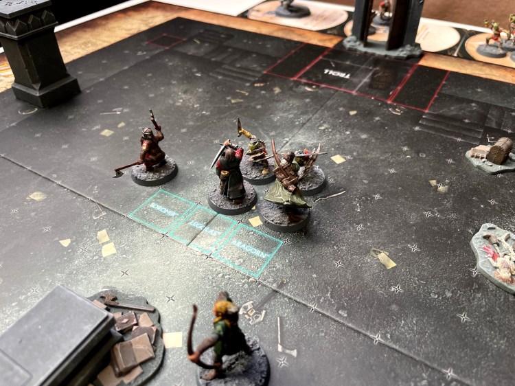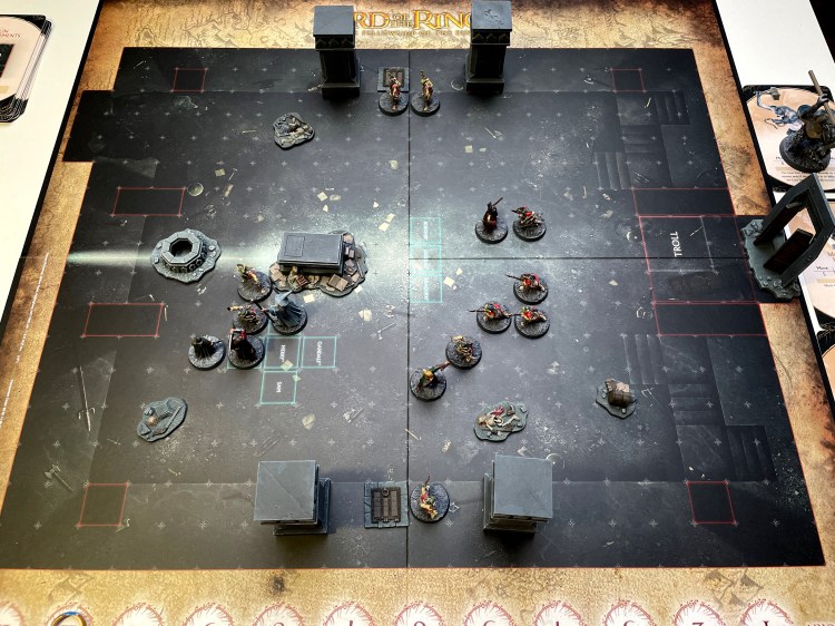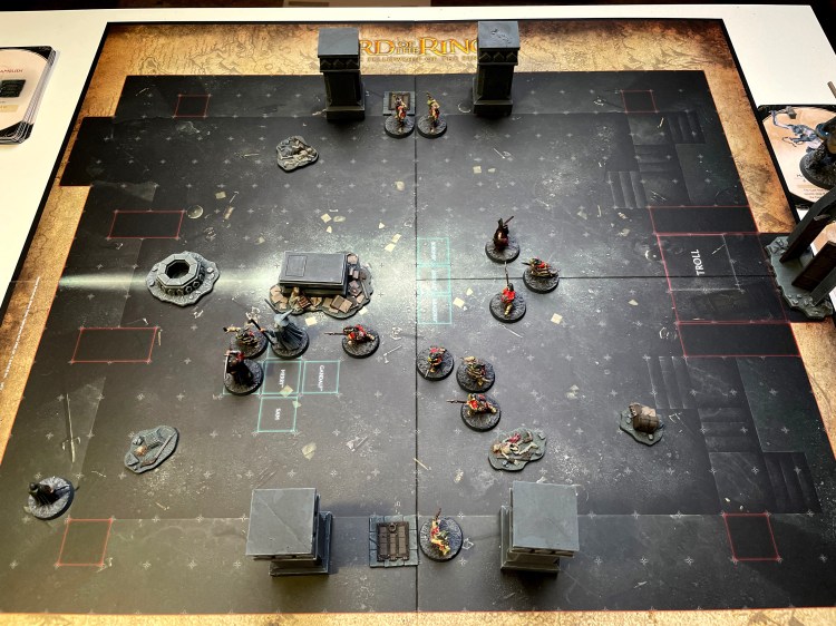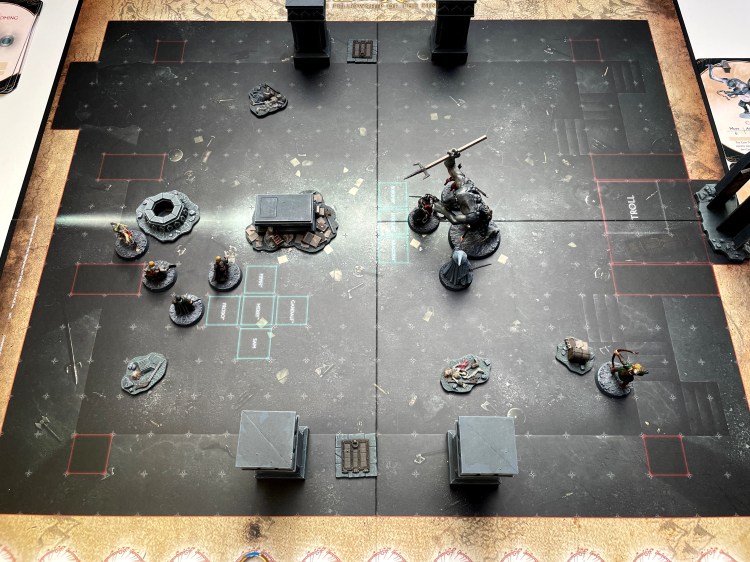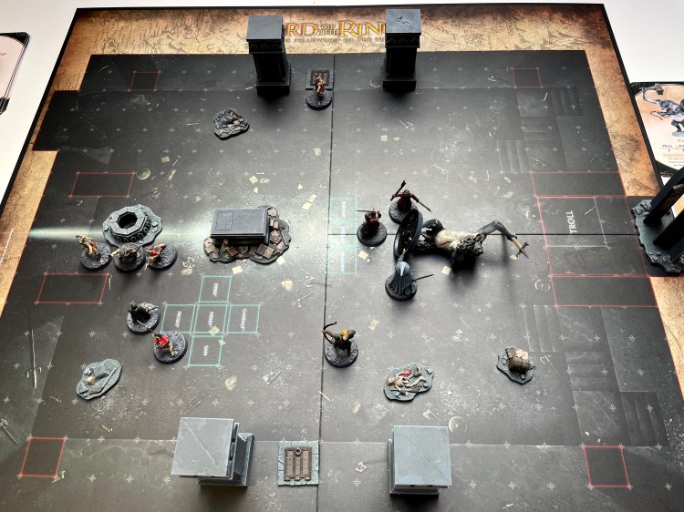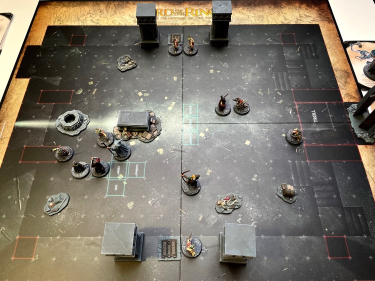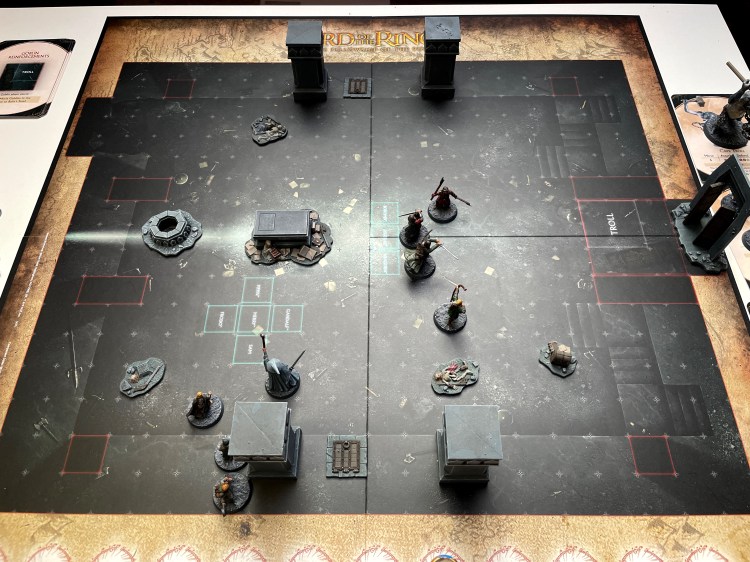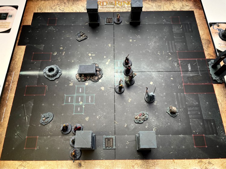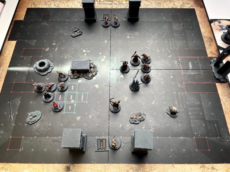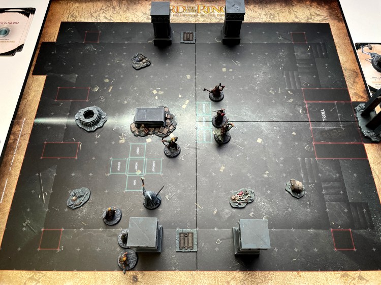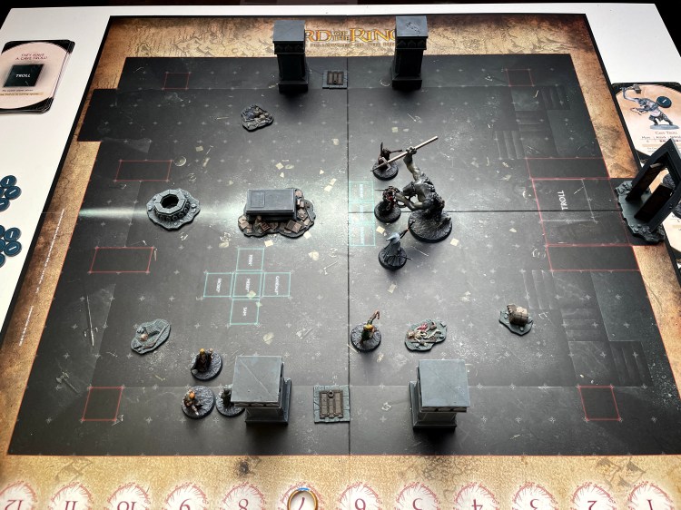 Je zwei Goblins erscheinen im Eingang und am Brunnen. Die Goblins attackieren Merry mit ihren Bögen, allerdings treffen sie nicht. Die gepanzerten Kollegen vom Eingang greifen Gimli und Gandalf an, sodass diese erst einmal vom Troll abgelenkt sind. Der kämpft derweil mit Boromir, hat aber nicht mit dessen Defensivfähigkeiten gerechnet. Den Gefährten muss jetzt dringend etwas einfallen.