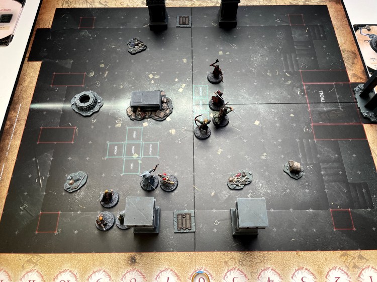 Jetzt wird es langsam eng. Im Eingang erscheinen drei weitere Gegner, weitere an Falltüren und Brunnen. Alles stürzt sich auf den Ringträger, der zwar eine Wunde erhält, sich aber dennoch auf den Beinen halten kann. Dafür regnen Pfeile auf Legolas und Boromir, wobei Boromir zwei Wunden einstecken muss. Gimli und Gandalf müssen sich der Angriffe aus dem Eingangsbereich erwehren, was ihnen jedoch gelingt. Diese Runde war schmerzhaft für die Gefährten.