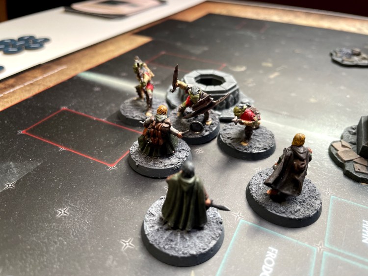 Pippin greift erfolgreich den Goblin an, der Frodo verfolgt hat. Merry stellt sich schützend vor Frodo und trifft den Goblin am Brunnen mit einem Stein, sodass dieser zu Boden geht. Gandalf macht nun kurzen Prozess mit dem Bogenschützen vor ihm. Mit dem Schwung dieser Attacke (zwei Ring-Symbole bei zwei Attackewürfeln!) dreht er sich zu Aragorns Angreifer und kann diesen ebenfalls ausschalten. Aragorn nickt ihm dankend zu, bevor er sich um einen weiteren gepanzerten Goblin kümmert. Gimli erledigt den letzten gepanzerten Goblin aus der Kampfreihe, die nun komplett ausgelöscht ist. Legolas duelliert sich mit den verbliebenen Bogenschützen und kann einen von ihnen ausschalten. Damit steht am Ende dieser Runde nur noch ein Goblin im Grab. Sollte das Entkommen leichter sein als gedacht?