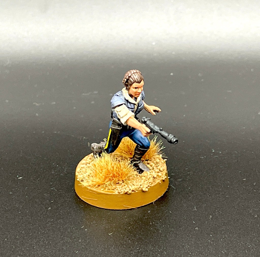 Beginnen wir mit Leia. Die Geister scheiden sich an dem Skulpt der Leia-Mini, vermutlich weil es ikonischere Outfits gibt, mit der man sie eher verbindet. Ich muss zugeben, ich konnte auch nicht ganz zuordnen, welche Uniform aus welchem Teil dargestellt sein soll (oder ich muss die Filme mal wieder schauen). Aber so blieb Raum für eine freie Interpretation. Ich habe versucht, mich an eine Rebellenflotten-Uniform anzulehnen. Daher die hellblaue Weste, um eine farbliche Verbindung zu den allseits bekannten Flottentrupplern herzustellen.