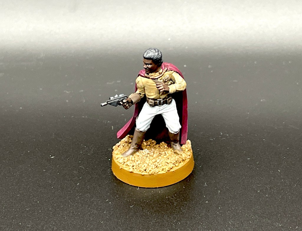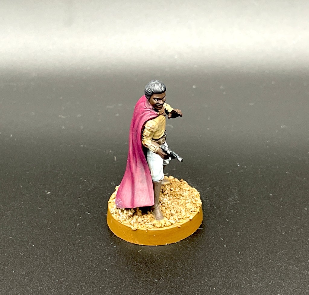 Bleibt noch Lando als dritter im Bunde. Er ist in seinen recht prunkvollen und farbenfrohen Klamotten dargestellt und genauso habe ich ihn bemalt. Der Umhang fällt schön fließend über den Rücken und hier kann man sich maltechnisch mit dem weichen Übergang auf den Stofffalten austoben. Ich habe es bezüglich des Malaufwands nicht zu sehr übertrieben, meine Modelle sind für den Spieltisch und nicht für einen Bemal-Wettbewerb. Insofern bin ich auch hier sehr zufrieden mit dem Ergebnis.