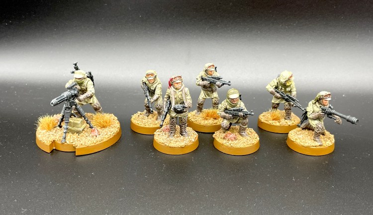 Während ich bei den normalen Rebellentruppen immer versucht haben, die Ausrüstung und Uniform-Teile farblich zu variieren, bin ich bei den Veteranen auf ein sehr uniformes Farbschema geschwenkt. Die Idee dahinter ist, dass die Veteranen besser ausgestattet werden als die hastig zusammengewürfelten normalen Truppen. Eigentlich tragen die Modelle vom Skulpt her alle Winterklamotten, da sie die Truppen aus der Schlacht um Hoth darstellen sollen. Für eine Einheitlichkeit mit meiner bestehenden Rebellenarmee bin ich dann jedoch auf ein einfaches Wüstenschema geschwenkt und muss sagen, dass es erstaunlich gut funktioniert.
