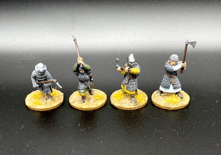 Und damit willkommen zurück auf dem Weg in die Ära der Kreuzzüge. Ich hatte im letzten Beitrag geschrieben, dass die Starterbox der Kreuzfahrer zu Fuß meinen Startpunkt bildet und so ist es auch eine Einheit aus dieser Box, die als nächstes auf dem Maltisch stand. Es handelt sich dabei um eine Gruppe von vier Veteranen mit Zwei-Hand-Waffen. Nach Saga-Regelsystem entspricht diese Gruppe einem Punkt. Die Zwei-Hand-Waffen geben den Veteranen einen Bonus beim Angriff, allerdings erkauft mit einem Malus bei der Verteidigung. Dabei ist nicht weiter ausgeführt, welche Zwei-Hand-Waffen es sein müssen. Das lässt dann grundsätzlich Freiheit bei der Wahl der Modelle.