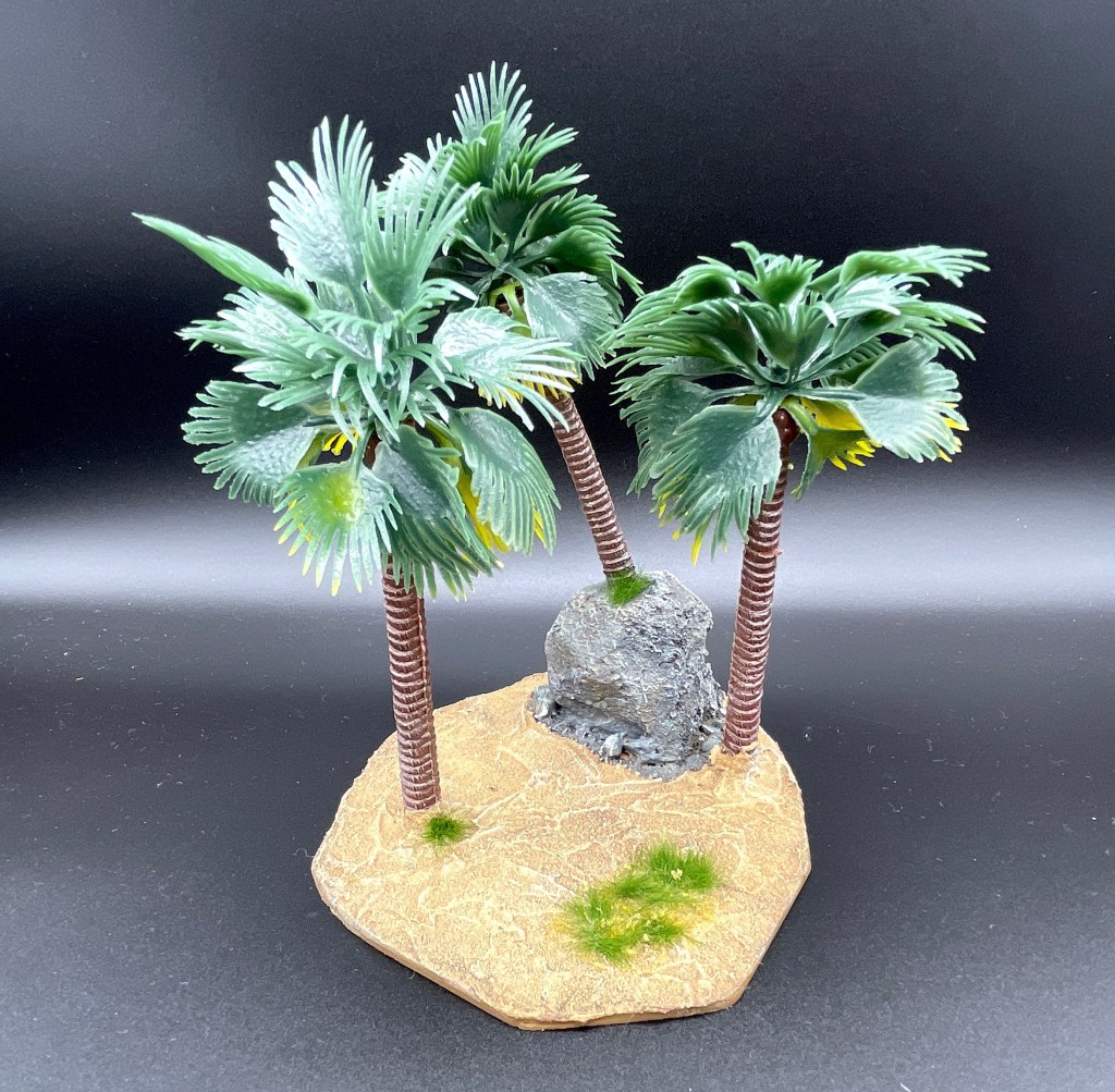 Gleichzeitig habe ich mich darangemacht, ein bisschen Scatter Terrain für die Spielplatte zu bauen. Mit Hilfe eines Stückes Hartschaum, einer MDF-Platte und ein paar Spielzeugpalmen aus Fernost ist ganz schnell ein folgendes Stück entstanden. Die Truppen Raimunds genießen den Schatten oder legen sich dort in den Hinterhalt.