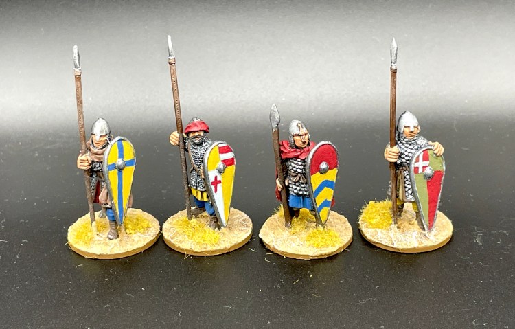 Es handelt sich um gepanzerte Kämpfer zu Fuß mit Speeren und Schilden. Die Modelle stammen ebenfalls aus der SAGA-Starterbox mit den Miniaturen von Gripping Beast (siehe hierzu meinen Beitrag zum Projektstart). Auch diese Kämpfer sind wieder sehr bunt geworden, da sie Teilnehmer des ersten Kreuzzuges sind und es zu diesem Zeitpunkt noch keine Orden und somit auch keine Ordenstracht gab. Analog der Veteranen aus dem letzten Beitrag sind es niedere Adlige, die Raimund von Toulouse auf seinem Weg folgen.