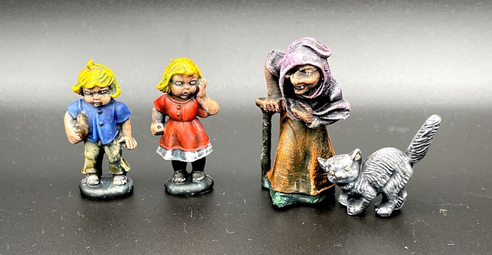 Normalerweise liegen den Bausätzen für Lebkuchenhäuser die Märchenfiguren als Papieraufsteller oder in ähnlicher Einweg-Form vor. Aber vor einigen Jahren hatte ich tatsächlich recht gut modellierte Figuren aus PVC beiliegen. Die Hexe kommt immerhin auf eine Größe von circa 5 cm, die ursprüngliche PVC-Farbe war beige. Und irgendwann kam dann die Idee, dass diese Figuren bemalt doch sicher noch besser vor ihrem Lebkuchenhaus aussehen würden.
