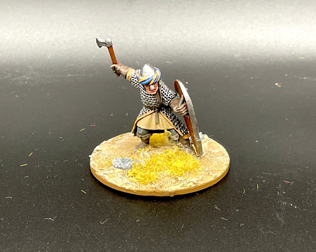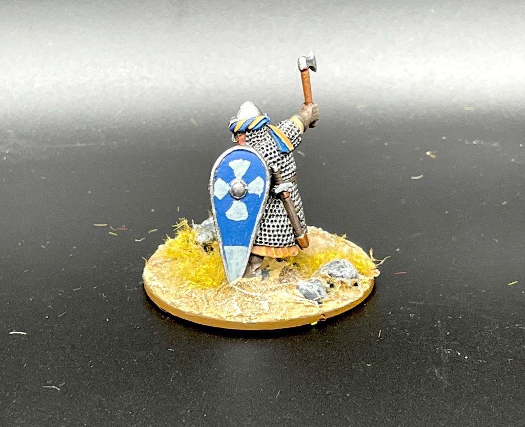 Beginnen wir mit dem Kriegsherrn. Bei SAGA braucht jede Armee einen Kriegsherrn, der sie anführt. Ein Kriegsherr hat ein paar besondere Fähigkeiten, teilt etwas mehr aus und steckt auch mehr ein als normale Einheiten. Gemäß der Grundregeln ist jeder Kriegsherr gleich und daher generisch. In der Startbox ist ein Kriegsherr enthalten, je nach Art der Startbox ist er entweder zu Fuß oder zu Pferd unterwegs. Meiner ist zu Fuß unterwegs, da ich mich für die langsame Truppe entschieden hatte. Einige von euch höre ich jetzt sagen: „Moment mal, du hast doch bereits Raimund von Toulouse als Kriegsherrn bemalt. Ich weiß es, es steht hier in deinem Blog.“ Völlig richtig, den hatte ich statt des 08/15-Einheitsanführer-Kameraden zuerst bemalt. Trotzdem sollte auch dieser etwas Farbe erhalten, denn schließlich kann Raimund nicht überall sein und eignet sich daher nicht für jedes Szenario. Ich habe versucht, durch die orangefarbenen Akzente seine Kleidung etwas edler als die der Krieger wirken zu lassen. Schließlich müssen wir davon ausgehen, dass es sich um einen Adligen handelt und der will seinen Status bestimmt auch im Feld zeigen. Da ich zeitlich nach wie vor im ersten Kreuzzug unterwegs bin, gibt es keine weißen Roben, da an die Ordenskrieger Ende des 11. Jahrhunderts noch nicht zu denken war.