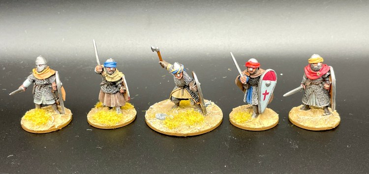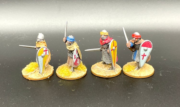 In den bisherigen SAGA-Spielen habe ich die Erfahrung gemacht, dass Kreuzfahrer-Veteranen eine ziemliche Herausforderung für die Sarazenen sein können. Die Idee war daher, einen weiteren Punkt zur Truppe hinzuzufügen. Ein Punkt entspricht bei Veteranen vier Mann. Dies muss nicht zwingend die Formation sein, in der sie eingesetzt werden. Man kann beispielsweise auch acht Veteranen zu einer Formation oder Einheit zusammenfassen, zahlt dann aber dafür auch zwei Punkte (von üblicherweise sechs verfügbaren Punkten). Viel schwerer wiegt meines Erachtens, dass die wichtigen SAGA-Würfel auf Basis von Formationen errechnet werden. Also geben viele kleine Formationen viele SAGA-Würfel und wenige große entsprechend wenig. Diese Überlegungen müssen in den Truppenaufbau einfließen und vier weitere Veteranen geben mir zumindest weitere Flexibilität bei der Armeezusammenstellung.