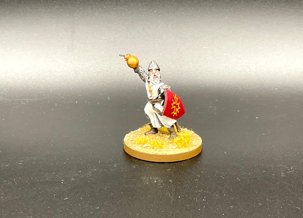 Zum SAGA-Erweiterungsband „Ära der Kreuzzüge“ gehört eine Mini von Raimund von Toulouse (in diesem Beitrag zu sehen). Eigentlich hält er ein Schwert in der rechten Hand, allerdings kann man die Pose der Miniatur ohne große Veränderungen verwenden, um eine Handgranate zu werfen. Ich habe daher das Schwert entfernt, mit einem Bohrer die Handfläche vertieft und eine Kugel aus meiner Bits-Box als Handgranate angeklebt. Ein Stück Draht dient als Zündschnur. Fertig ist der – historisch nicht ganz korrekte – alternative Anführer meiner Kreuzfahrer-Truppe.