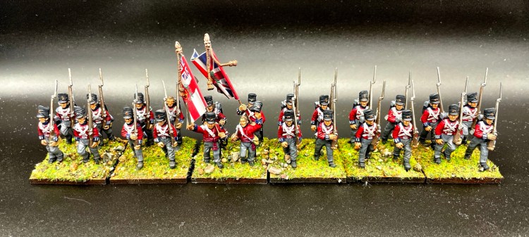 Der Zusammenbau ist denkbar einfach, da außer Köpfen und Rucksäcken nichts weiter zu kleben ist. Bei der Bemalung habe ich mich recht eng an das Tutorial von Warlord Games gehalten, da ich ebenfalls Vallejo-Farben benutze. Hier die fertige Einheit mit den Fahnen des 33rd (West Riding) Regiment of Foot.