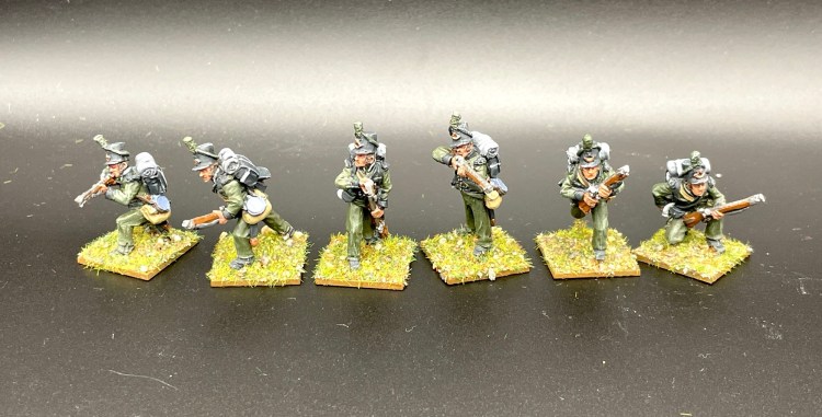Als Ergänzung zu meiner wachsenden Infanteriebrigade wollte ich dieser noch eine Kompanie Rifles, also Schützen oder Jäger, hinzufügen. Hier habe ich auf Figuren von Perry Miniatures zurückgegriffen. Diese bieten die Figuren in verschiedenen Posen in Sechserpacks an. Die Figuren sind komplett aus Metall und erfordern keinerlei Zusammenbau, allerdings sind sie vergleichsweise teuer.