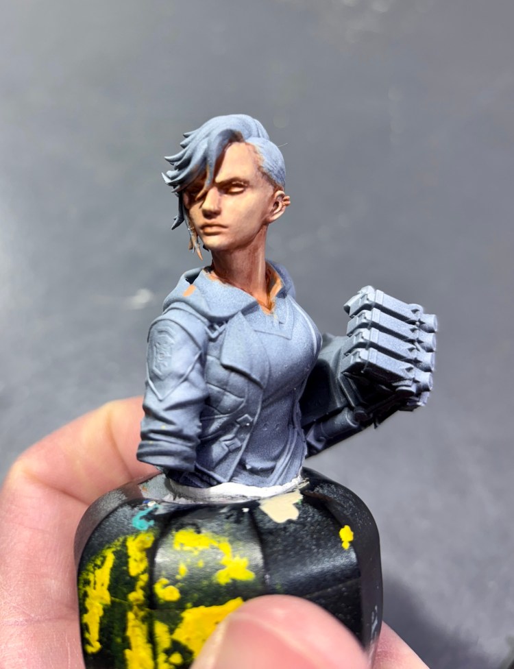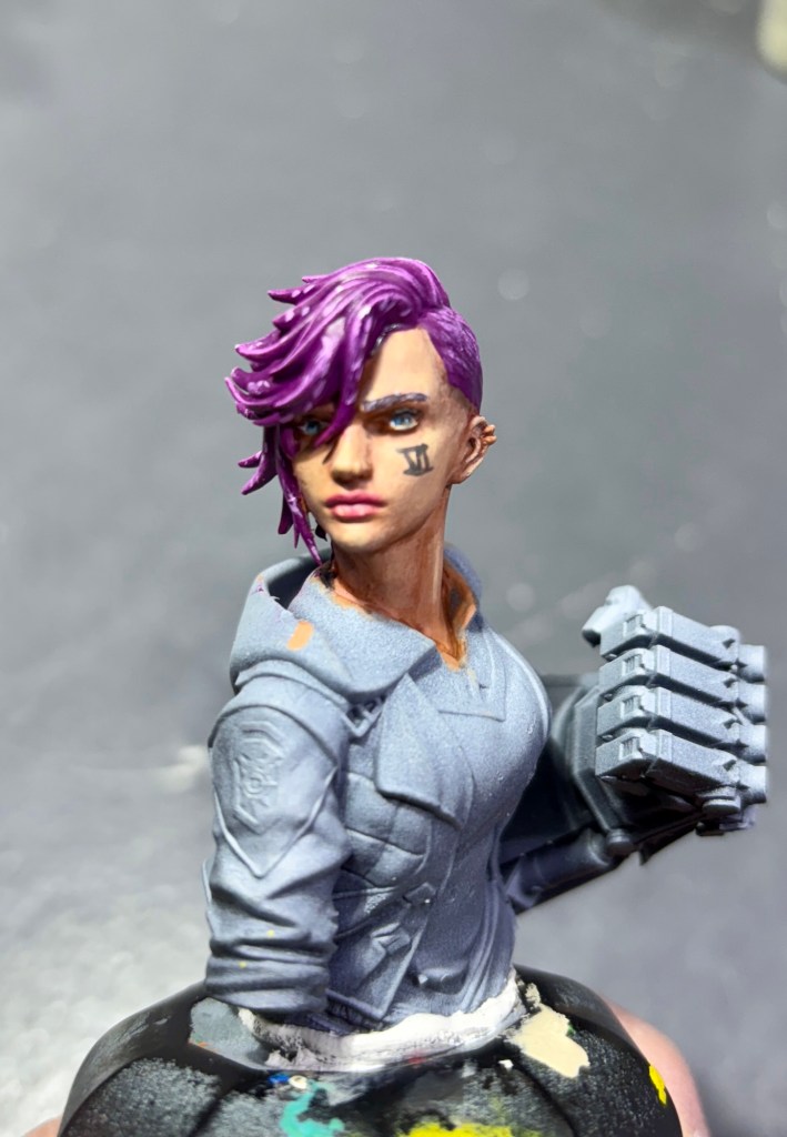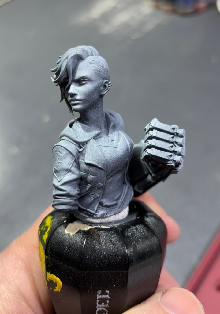 Bei unserer Büste handelt es sich um einen Charakter names VI. Die Dame ist aus dem Spiel „League of Legends“ beziehungsweise der Netflix-Serie „Arcane“ bekannt. Grundlage für die Bemalung war auch hier eine Grundierung mit schwarzem Lack, versehen mit einem zenitalen Highlight. Gerade in dieser Größe hilft das Highlighten ungemein, die Lichteffekte zwischen hell und dunkel zu verstärken.