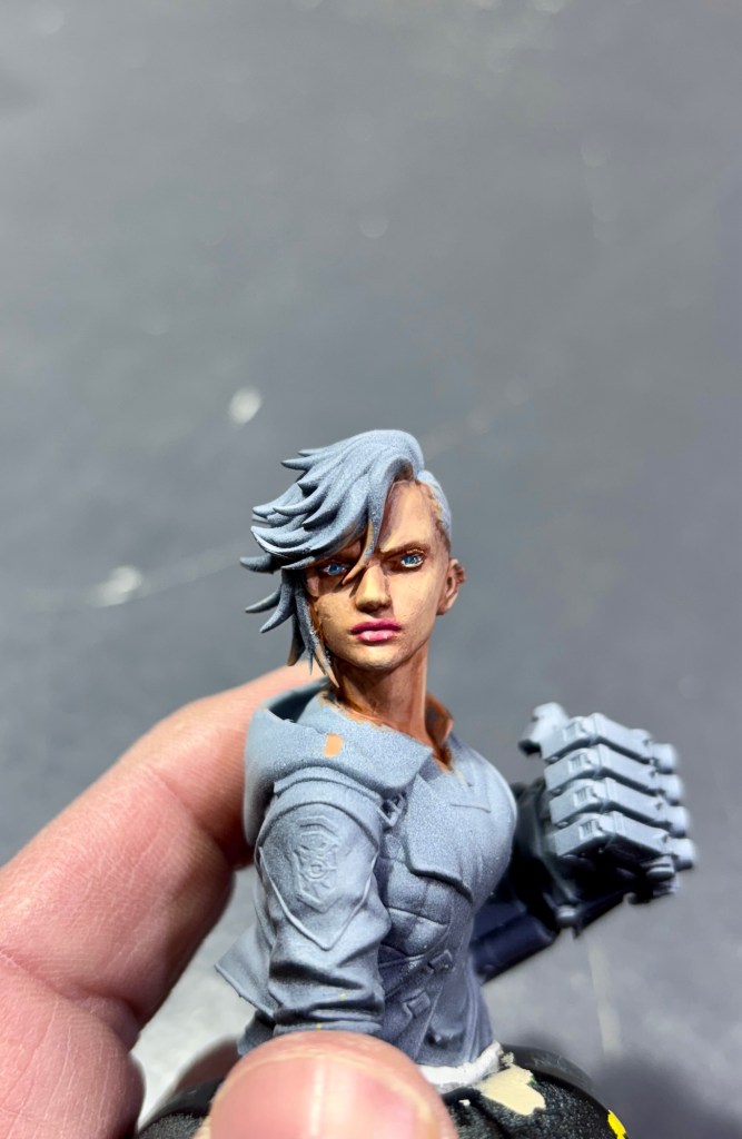Zum Schluss folgten dann Details wie Augenbrauen, das Tattoo auf der Wange und die Haare. Hier wurde wieder ganz klassisch mit Grundfarbe, Wash und Trockenbürsten vorgegangen.