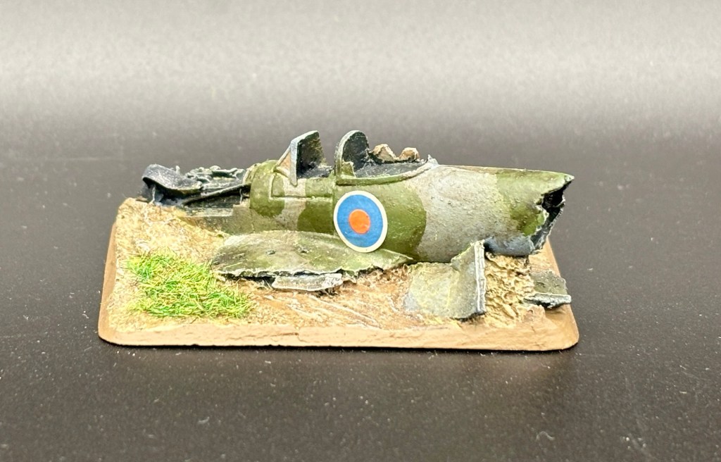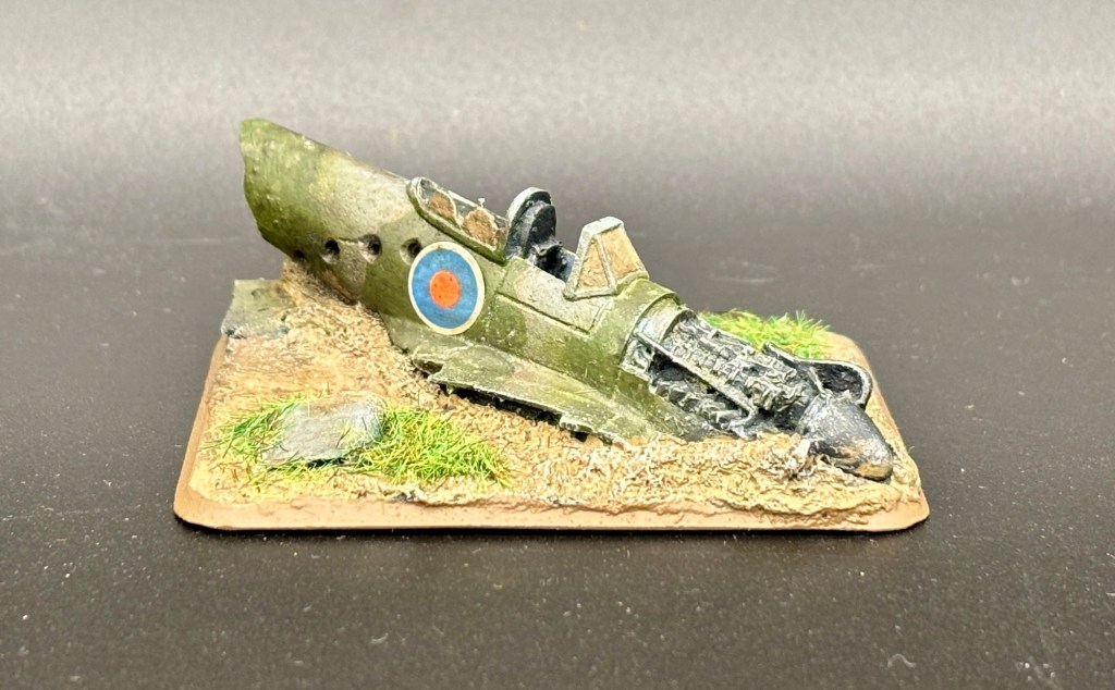 Die Typhoon hat beim Absturz einigen Schaden genommen, sodass nur noch ein Teil des Rumpfes vorhanden ist. Die Grundfarbe des Flugzeugs ist Vallejo Neutral Grey auf einer schwarzen Grundierung. Die grünen Flecken der Tarnung habe ich – historisch absolut unkorrekt – mit Luftwaffe Camo Green aufgetragen. Ich hatte kein passenderen Farbton zur Hand. Nach einem Wash mit Agrax Earthshade und Trockenbürsten erhielt das Wrack einen Wash mit dem Desert Sand Model Wash von Vallejo. Die Idee war, dass der Absturz jede Menge Staub aufgewirbelt hat. Der hat sich nun auf das Wrack niedergelegt.