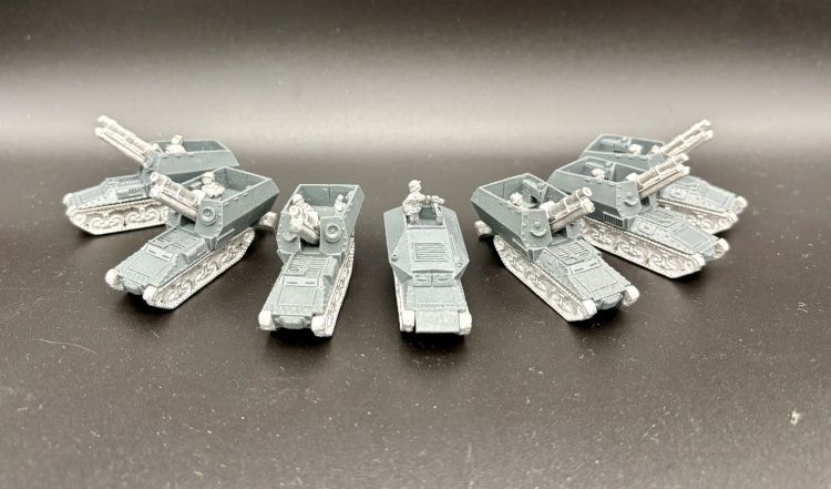 Ebenfalls aus der Werkstatt Major Beckers stammen die Sturmgeschütze auf Basis von Hotchkiss-Fahrwerken. Hierbei handelte es sich um französische Panzer, deren Wanne einen offenen Aufbau erhielten und mit 7,5cm-Panzerabwehrkanonen oder 10,5cm-Haubitzen ausgestattet wurden. Die Fahrzeuge mit PaK sollten aus vorbereiteten Positionen die vorrückenden Panzer direkt bekämpfen. Die Fahrzeuge mit den Haubitzen waren in der Nähe in Stellung und konnte so recht schnell Artillerieunterstützung geben. Im Falle eines erfolgreichen Durchbruchs des Gegners konnten die Haubitzen zur Panzerbekämpfung im direkten Richten genutzt werden. In Battlefronts Armeebox sind sieben Fahrzeuge enthalten mit je der Option für eine der beiden Varianten. Ich habe von einem Freund zwei weitere Fahrzeuge aus einer Sammlungsauflösung erhalten. Daher auch das bereits grundierte Geschütz in der Mitte.